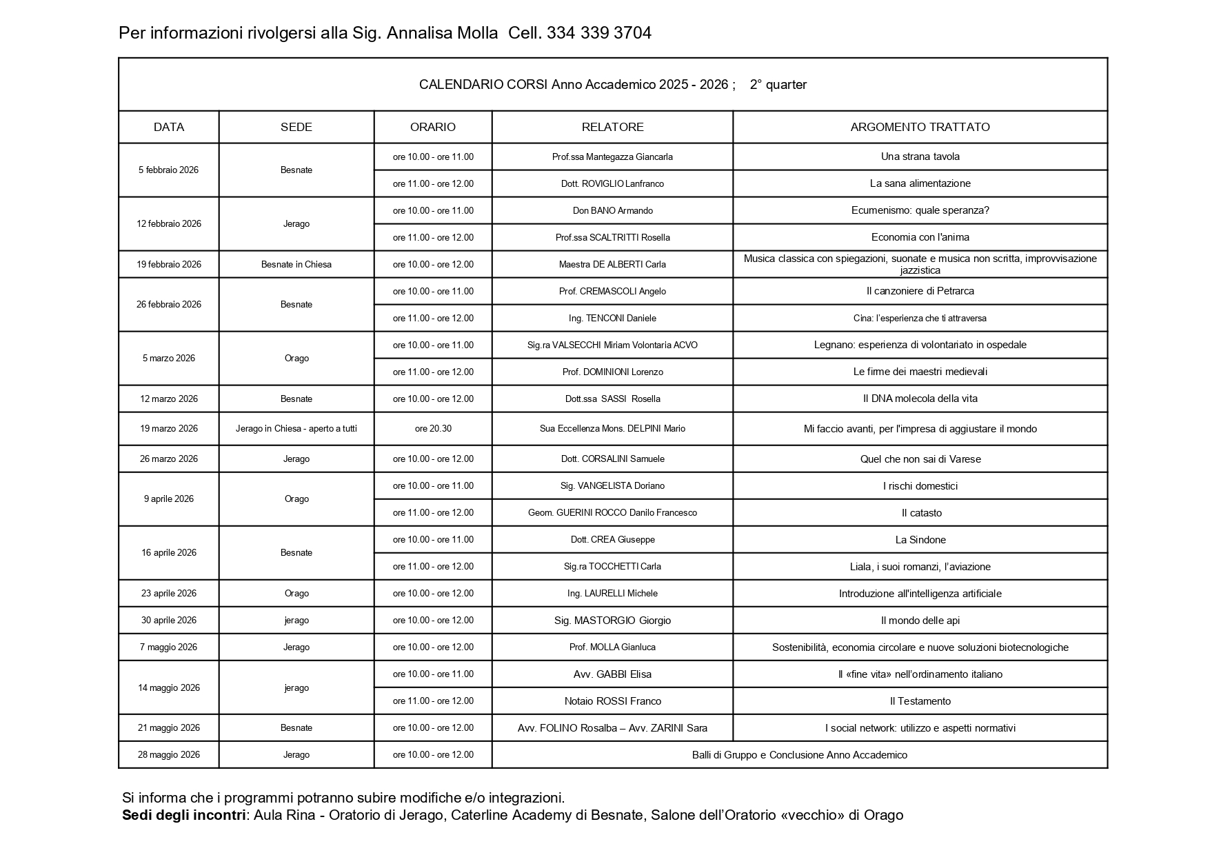 Calendario del 2° quadrimestre del corrente anno accademico dell'Università della Terza Età di Jerago con Orago e Besnate.