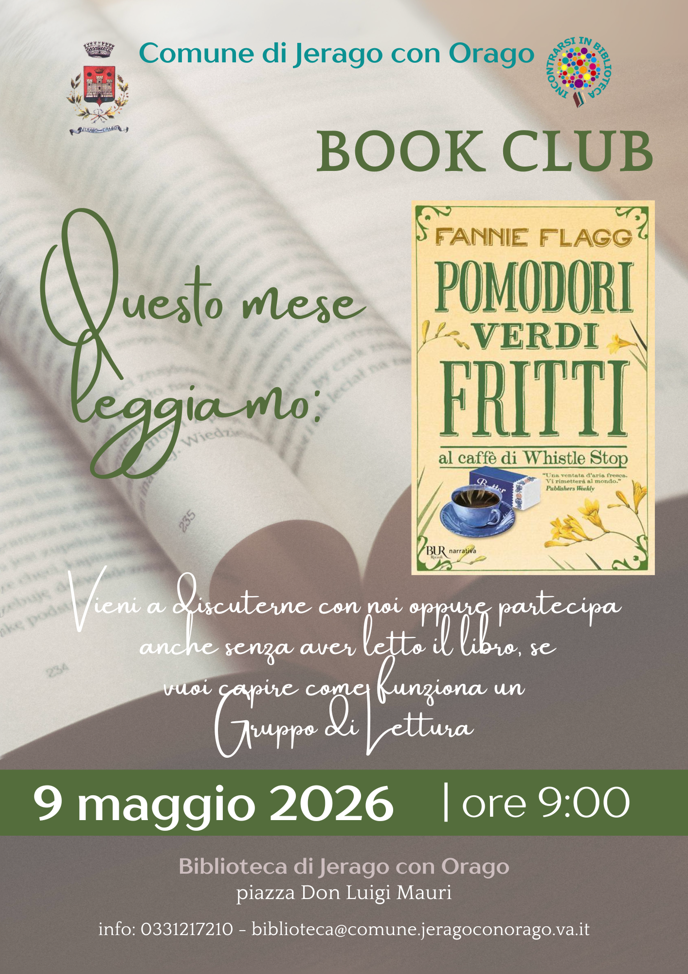 Incontro del gruppo di lettura presso la biblioteca comunale per discutere del libro Pomodori verdi fritti al caffè di Whistle Stop sabato 9 maggio 2026 alle ore 9:00. Partecipazione libera e gratuita